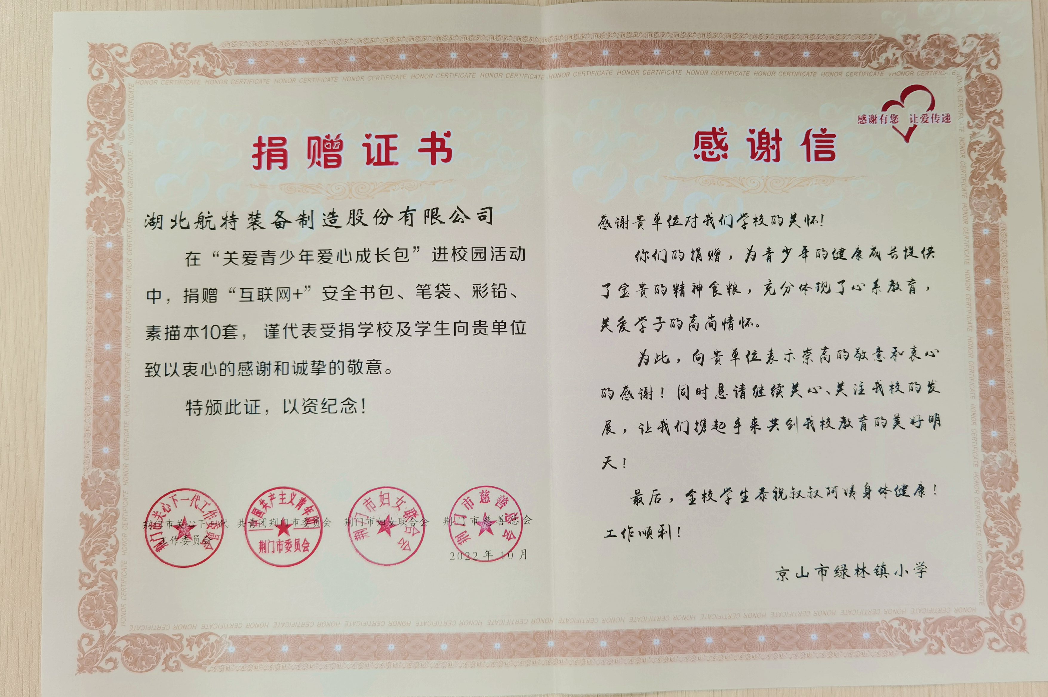 積極支持國家扶貧戰(zhàn)略,相繼為漳河鎮(zhèn)袁沖村、麻城鎮(zhèn)鄧沖村和市健康扶貧醫(yī)療基金捐款25萬元;為京山市綠林小學(xué)捐贈(zèng)愛心成長包;2020-2022三年疫情期間,在保障員工基本利益的情況下,力保主要客戶供貨,同時(shí)為客戶、社會(huì)捐贈(zèng)愛心款和防疫器材,彰顯航特?fù)?dān)當(dāng)。
